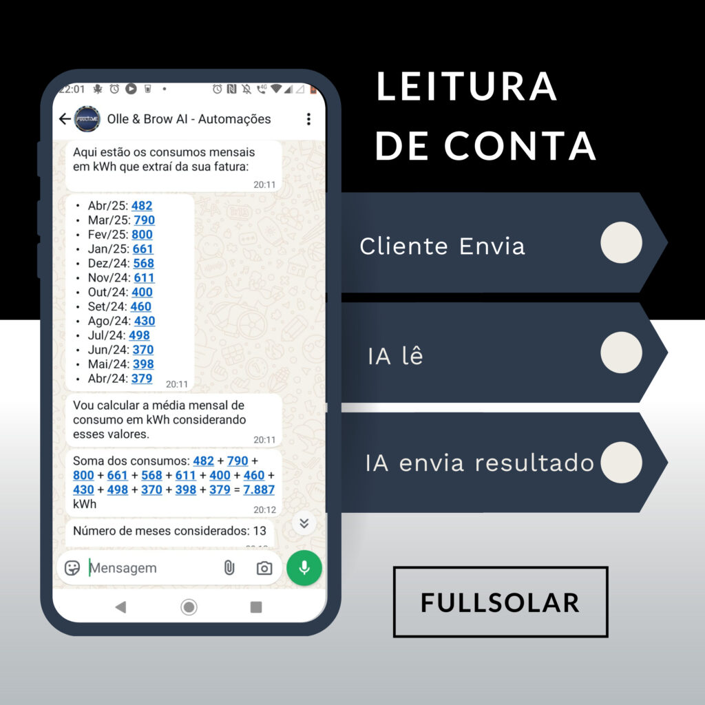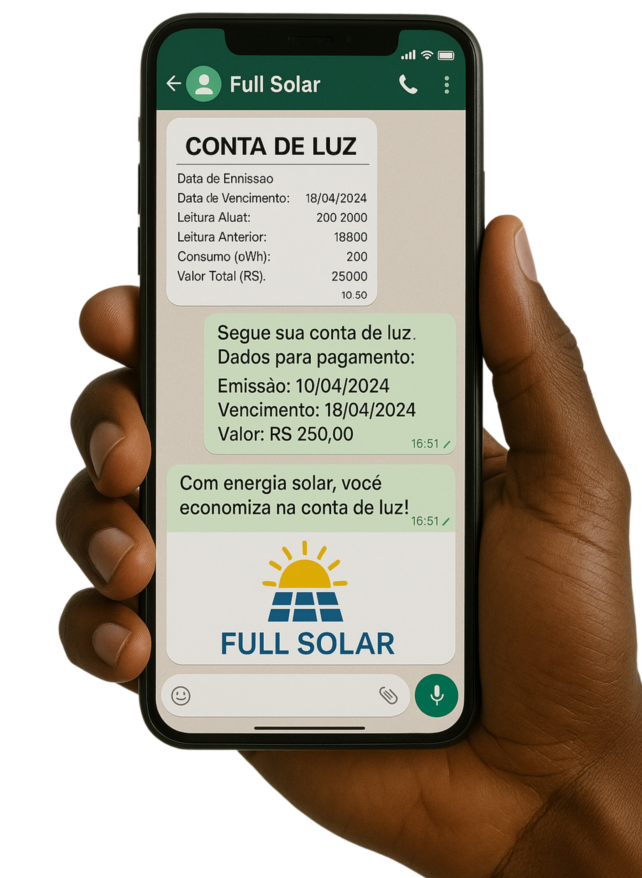 Imagine a seguinte situação: seu Cliente está pensando em adotar a energia solar, mas quer ter uma ideia clara do seu consumo energético ao longo do último ano. Com a Full Solar, esse processo é incrivelmente simples. Basta iniciar uma conversa com o nosso Agente de IA no WhatsApp. Ele te guiará de forma intuitiva e solicitará o envio de uma foto da sua conta de luz referente aos últimos 12 meses.