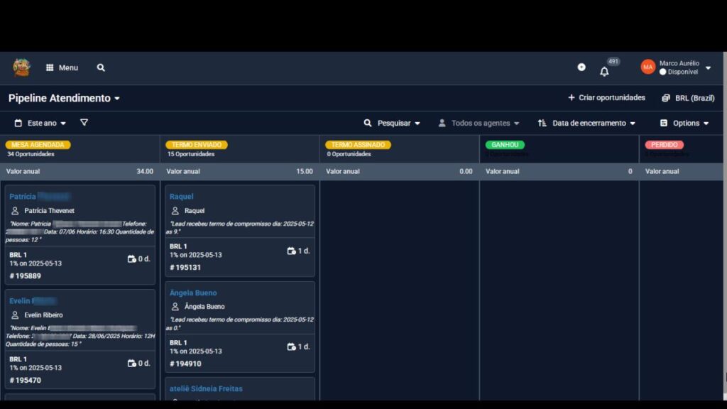 Criação Autônoma de Oportunidade: Ao receber a primeira mensagem, a IA automaticamente cria uma nova oportunidade no CRM com o status “Novo Lead”, registrando o nome e telefone do contato.