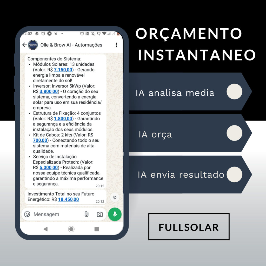 Essa funcionalidade inovadora do ecossistema de atendimento e vendas da Full Solar demonstra o poder da inteligência artificial para otimizar a experiência do cliente. Ao oferecer um orçamento rápido, detalhado e transparente diretamente no WhatsApp, seguido de uma proposta formal em PDF e um convite para o fechamento, a Full Solar simplifica o processo de adesão à energia solar, tornando-o mais acessível e eficiente para seus clientes.